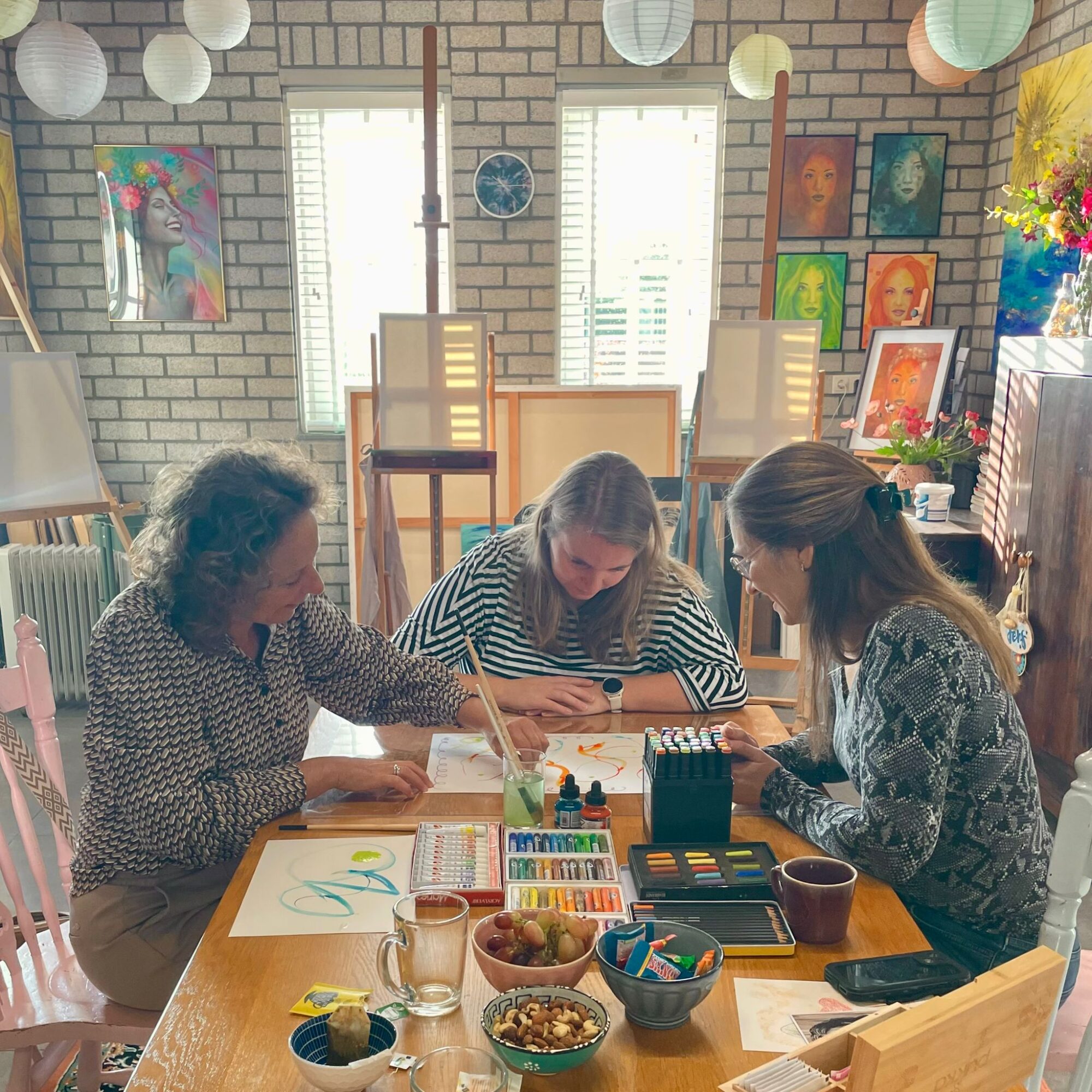 Vandaag waren er drie vrouwen in mijn atelier voor een ochtend intuïtief schilderen. Eerst landen, uit het hoofd. Daarna spelen met kleur en vorm. Het resultaat: mooie inzichten, een gevoel van vrijheid én drie heel eigen, krachtige werken.
