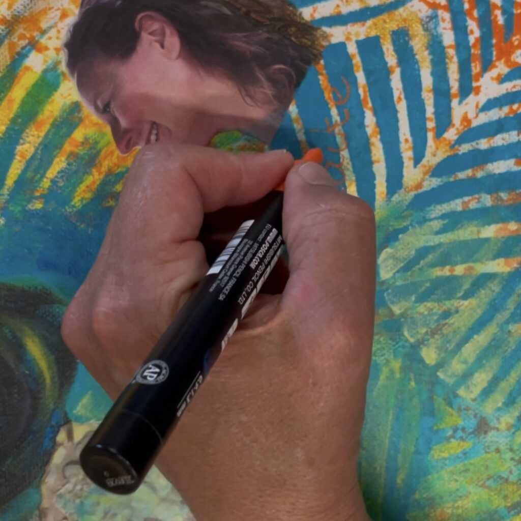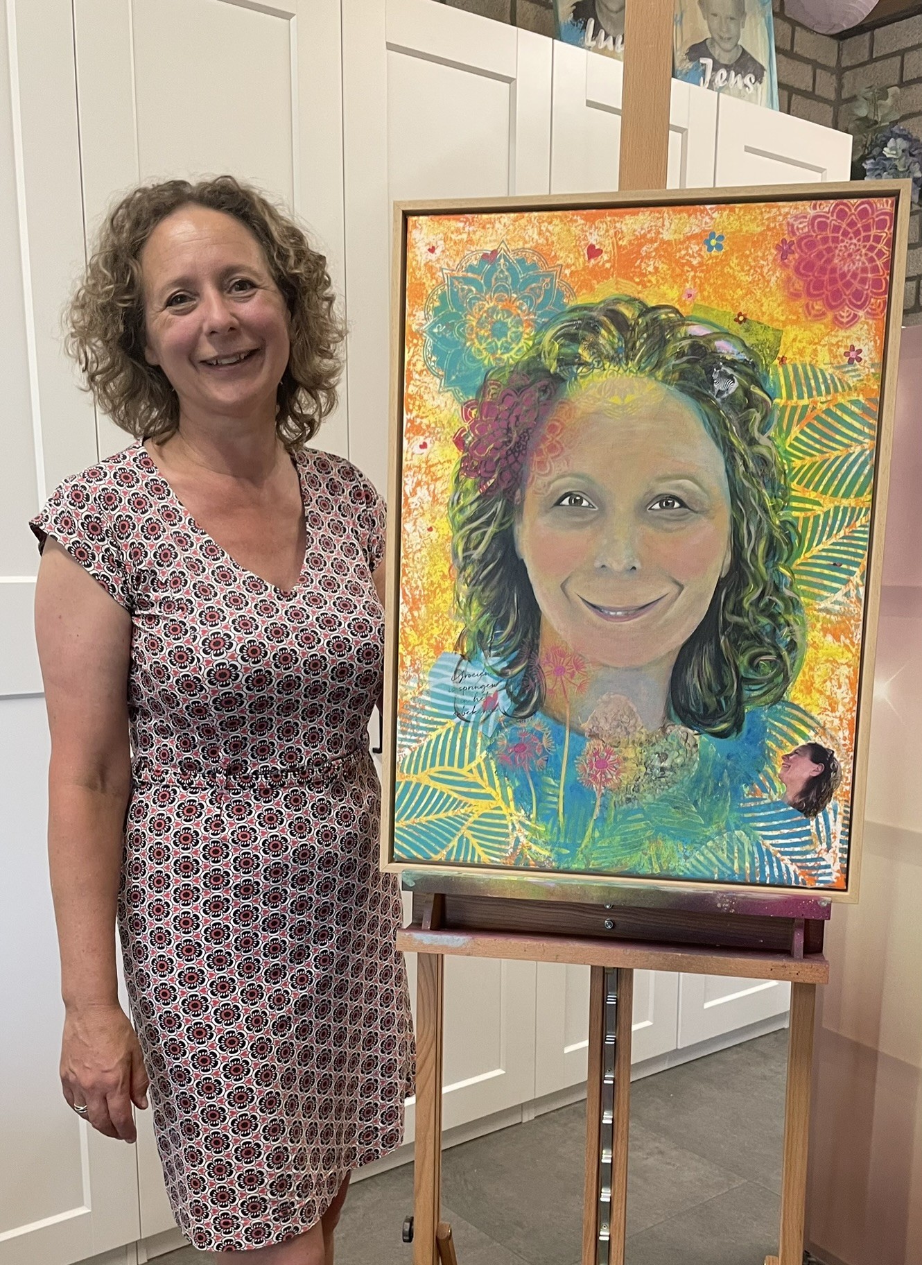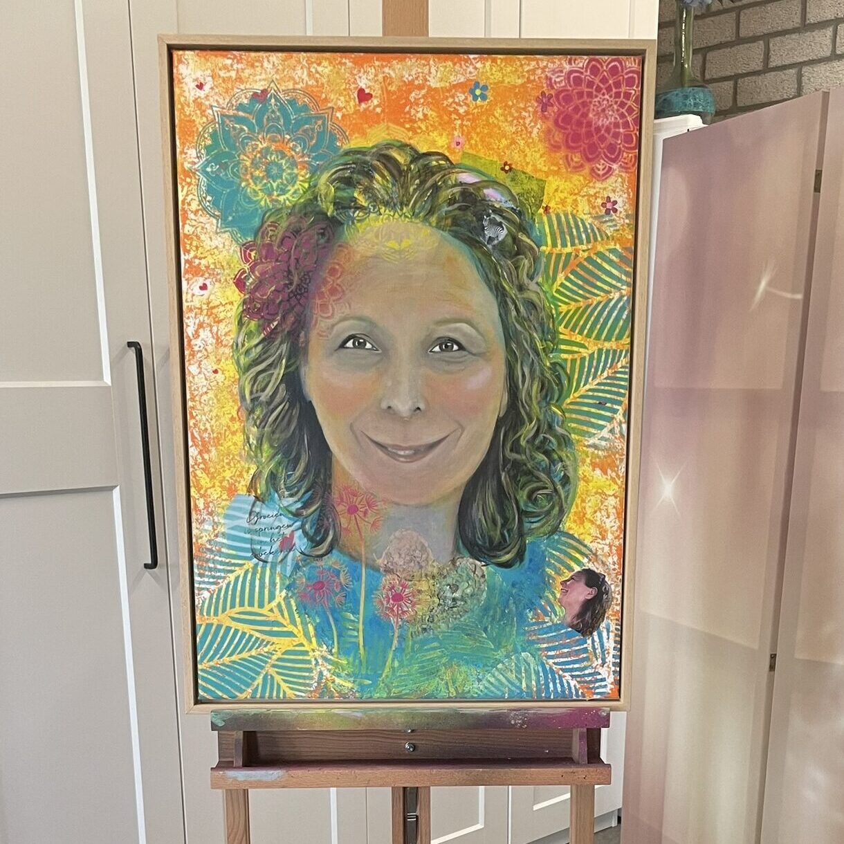 Een portret dat ik schilderde over het doek dat zij eerder maakte tijdens de schilderbeleving Van binnen naar beeld.